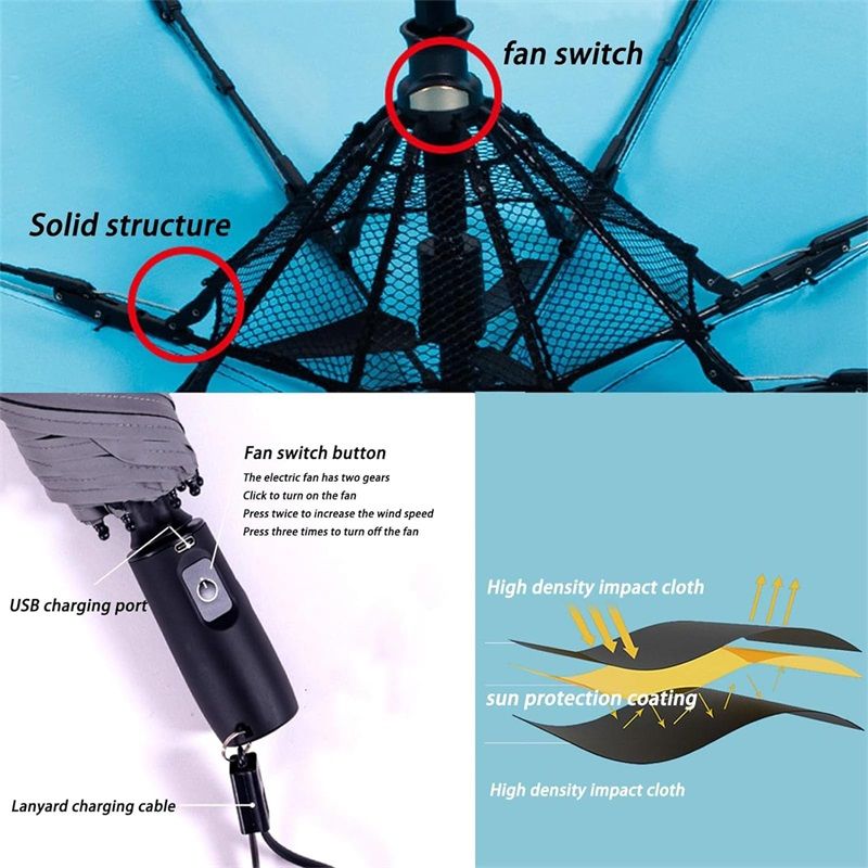 PARAGUAS PORTÁTIL 3 EN 1 CON VENTILADOR: El Paraguas Con Protección UPF50+ UV tiene un pequeño ventilador incorporado. Este paraguas 3 en 1 puede protegerte del sol mientras te brinda viento fresco, refrescándote en el caluroso verano.